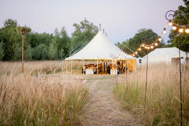 "We wanted to create different experiences as you moved through the different parts of the evening. We started with cocktails under a giant oak tree with soft lights hidden in the tree. Then we followed a festoon-lit path to the big white canopy nestled in the tall grass. For the table, we selected French bistro chairs against a crisp white tablecloth and big baskets of crudités for a touch of vibrant and bold colour. After dinner, we followed the path into a clearing with fire pits, hay bales topped with Métier cushions, and a maypole decorated in bright, warm colours.”