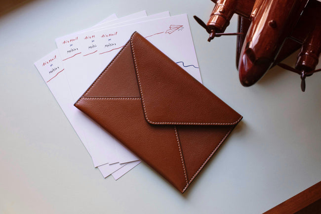 "We wanted to create a selection of products that speak to your inner journalist. From your Notebook to your Folio for your papers, the pieces celebrate the art of writing. The colour story I created is inspired by the Air Mail colour palette, and I particularly love the logo we created together.” - Melissa Morris