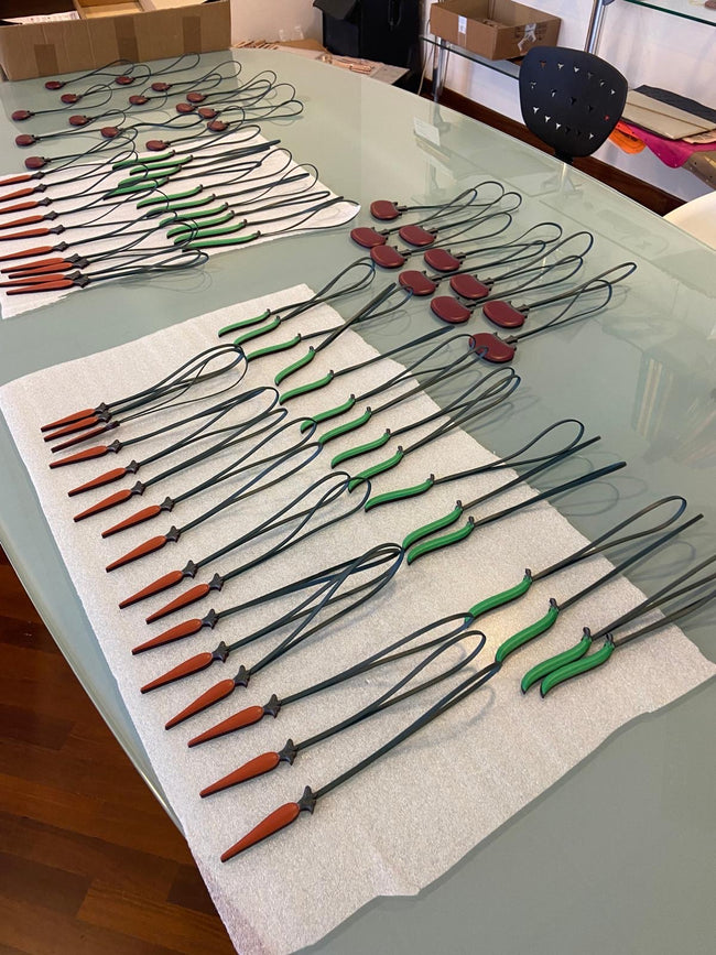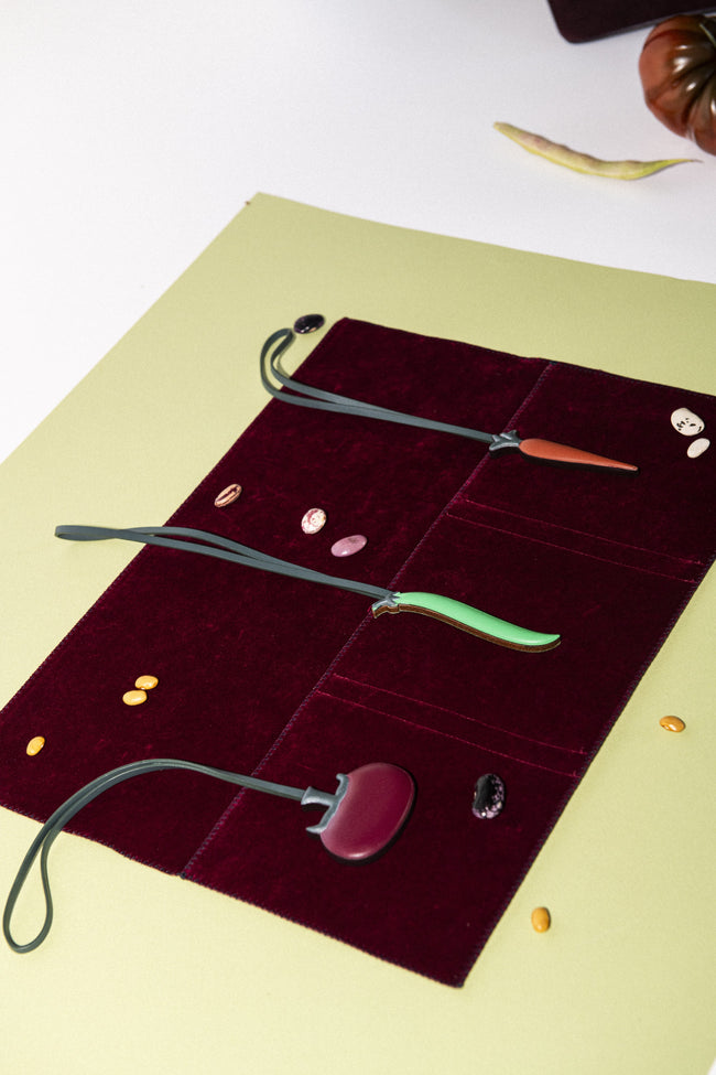 We then laser trim the edges which are then glued for extra reinforcement, and a strap with a slim slot at the top is added so the charm can be looped around the handle of your bag or neatly folded around a napkin.