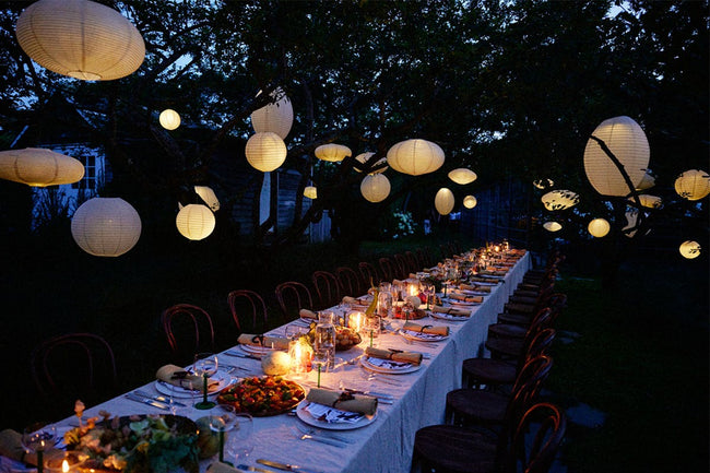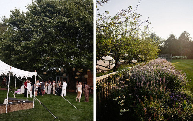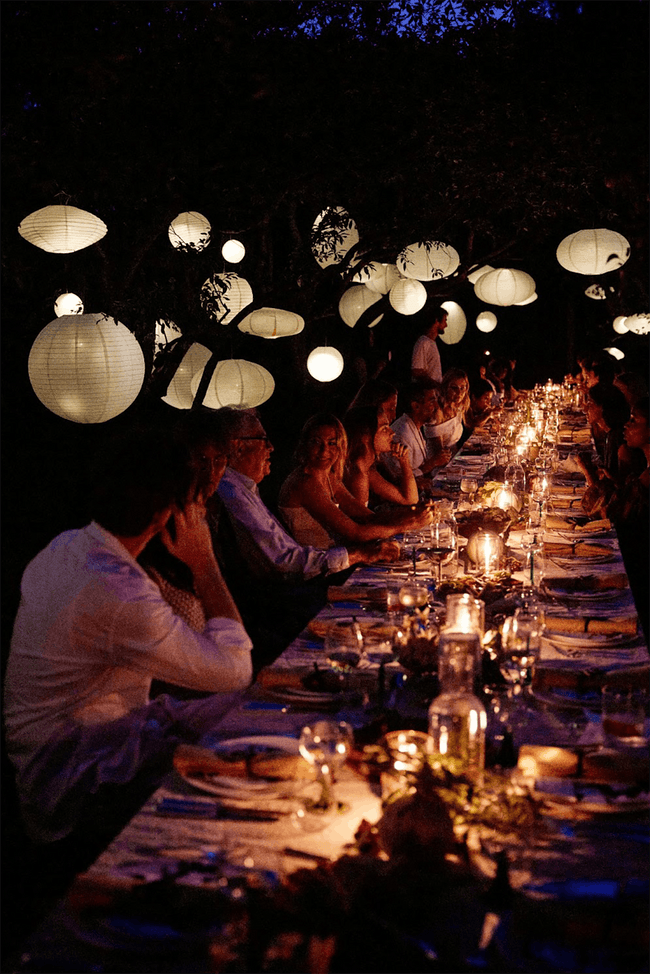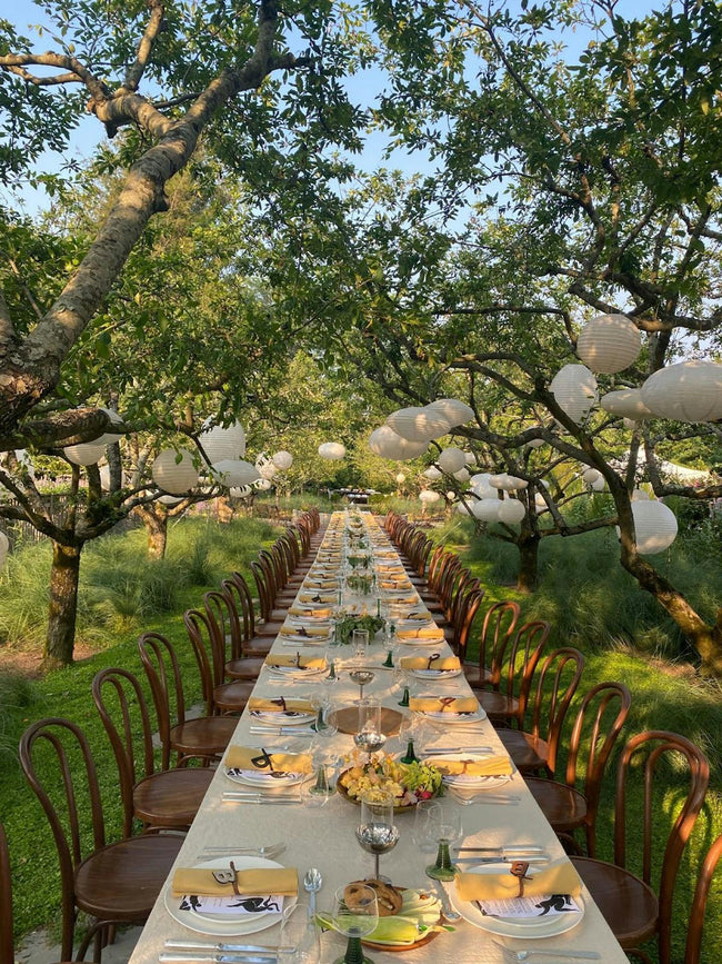 Guests were invited to dinner at a long table in a pathway lined with crabapple trees, decked with tea-stained Japanese lanterns.