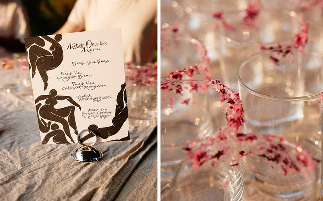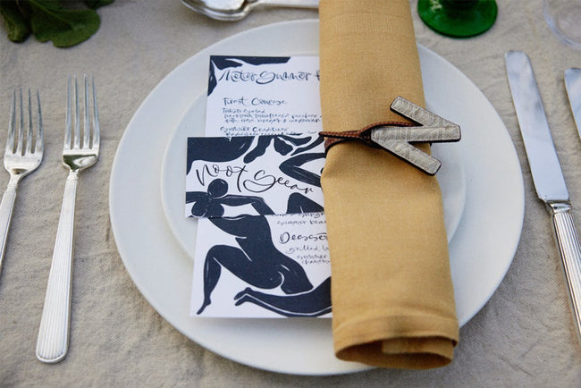 The menu and handwritten place cards were inspired by Henri Matisse’s La Danse. Matisse’s masterpiece was commissioned by and exhibited at the Barnes Foundation in Philadelphia, where Melissa and the Adlers, our hosts, are from. Every guest received a Personalisation Letter Charm with their initial.