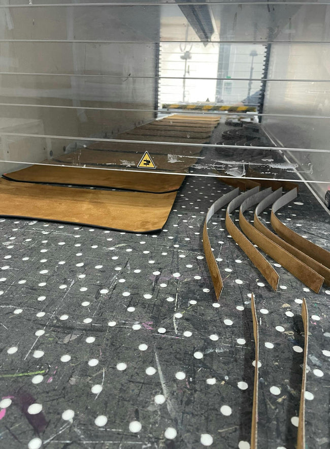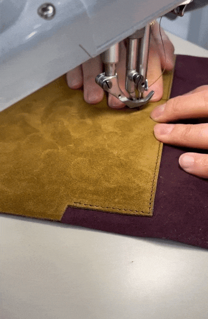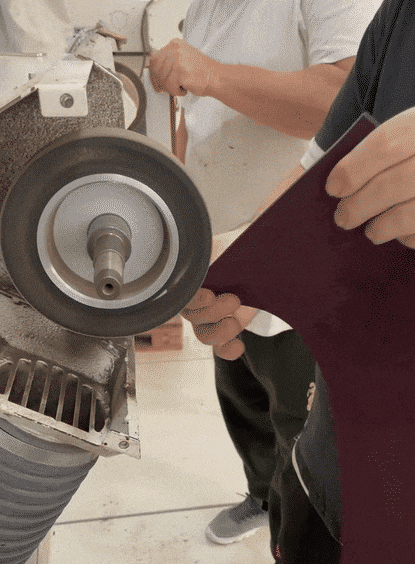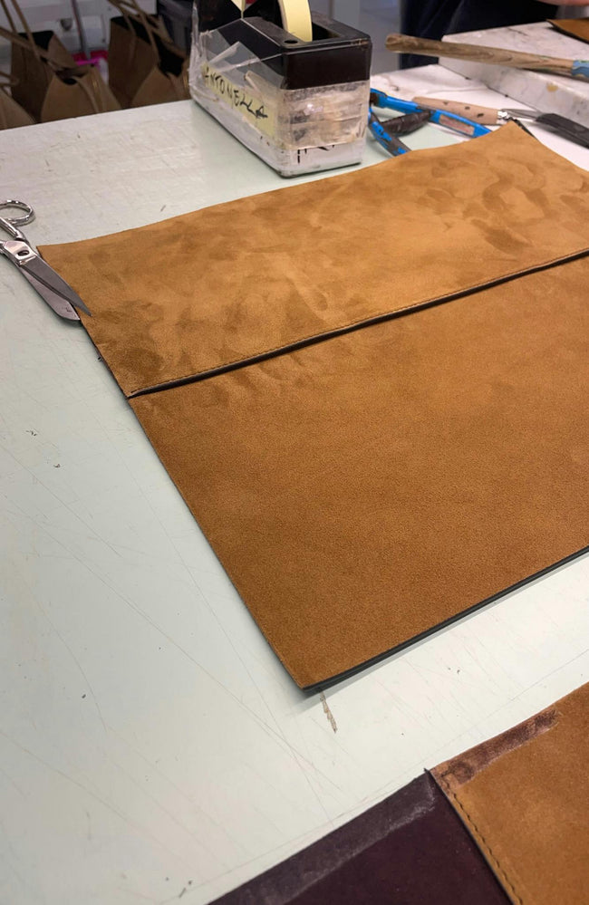 Part of our signature 11-step edge painting process, the edges of each panel of leather are sanded down before being primed and painted by hand.