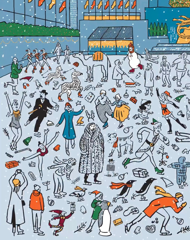 A regular Zine contributor, the illustrator and designer Rob Wilson is the brain behind this year’s ‘A-Maze-Ing Holiday Travel Maze’, in which Milo attempts to navigate the perilous gauntlet of holiday airport travel. Rob’s fabulous ‘Where’s Milo?’ drops our intrepid traveller amidst a crush of characters in New York City’s infamous Rockefeller Center skating rink. Can you spot him in the crowd?