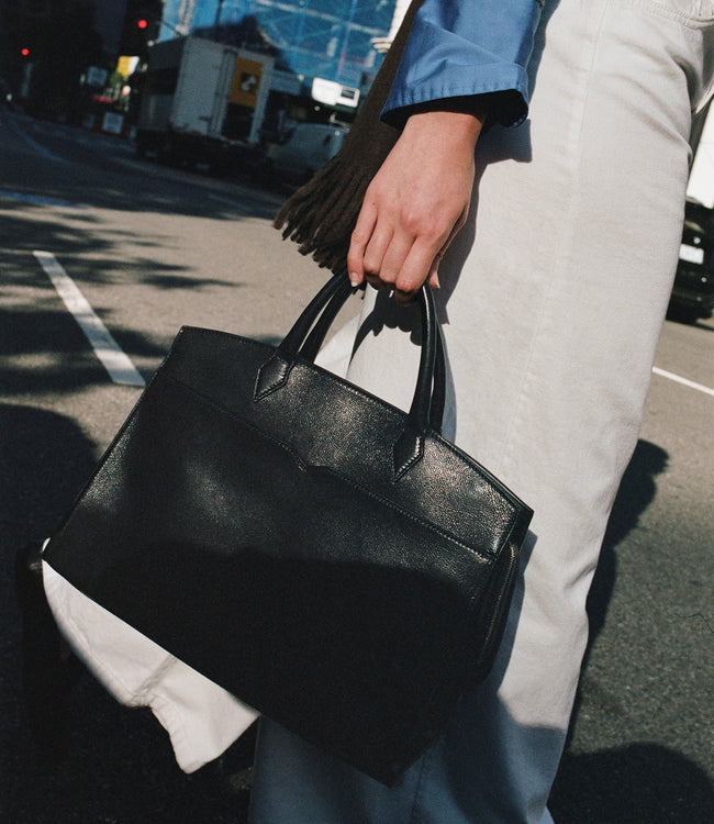 The Pendulum is an elegant solution for work and everyday, featuring a pared-back design and minimal seams for a featherlight construction. Métier’s signature diamond motif appears in distinctive details, from the bag’s diamond-shaped handle points to a geometric notch in the front exterior pocket.