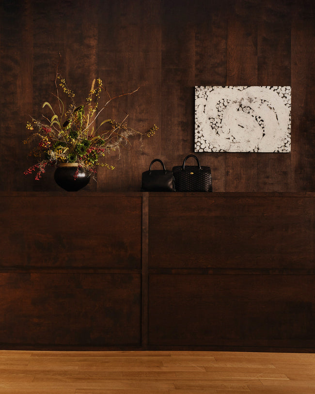 Métier’s New York Residency invites visitors to experience our collections in the heart of Soho. Métier Creative Director Melissa Morris conceived the space in collaboration with designers Akari Endo-Gaut and Currie Ritchie, blending Art Deco elegance with the relaxed minimalism of 90s New York. The interior’s espresso-stained wood walls and banquette seating provide a warm backdrop for custom, brushed-aluminum display tables and black-lacquer plinths. Monolithic, Richard Serra-inspired shapes are juxtaposed with soft, sensual fabric draped throughout the space, infusing it with a sense of drama.