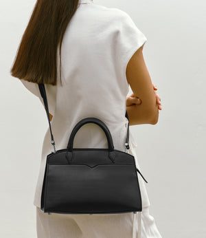 The Pendulum 30 is a slim and compact handbag, featuring a pared-back design and minimal seams for a featherlight construction. Métier’s signature diamond motif appears in distinctive details, from the bag’s diamond-shaped handle points to a geometric notch in the front exterior pocket.